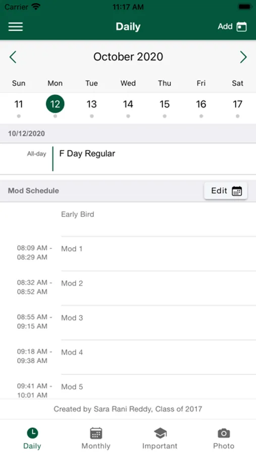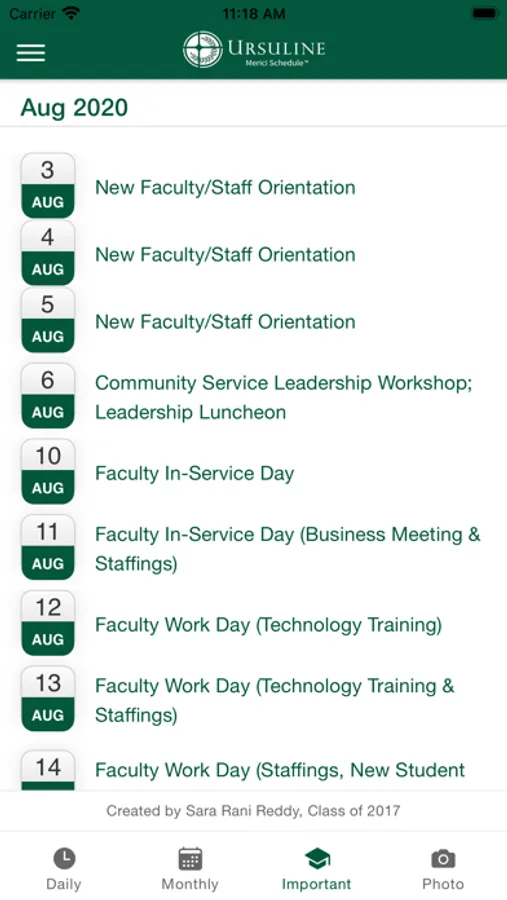 Ursuline’s Merici Schedule™ app is designed in the spirit of St. Angela Merici, enabling students to manage their personalized schedules. This app is perfect for managing a modular school schedule for both students and staff. It conveniently coordinates a personalized student or staff schedule with the 6 letter days and varying activity schedules. The primary goal of the app is to provide students and staff a tool that helps them stay organized with their time.