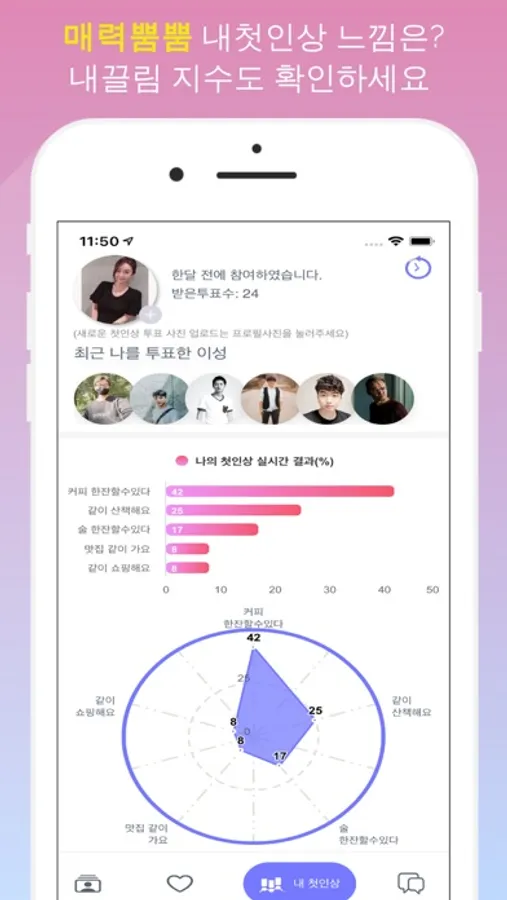 * 다른 회원들이 실시간으로 내가 설정한 첫인상 키워드 중 가장 내 사진과 어울리는 키워드에 투표합니다.