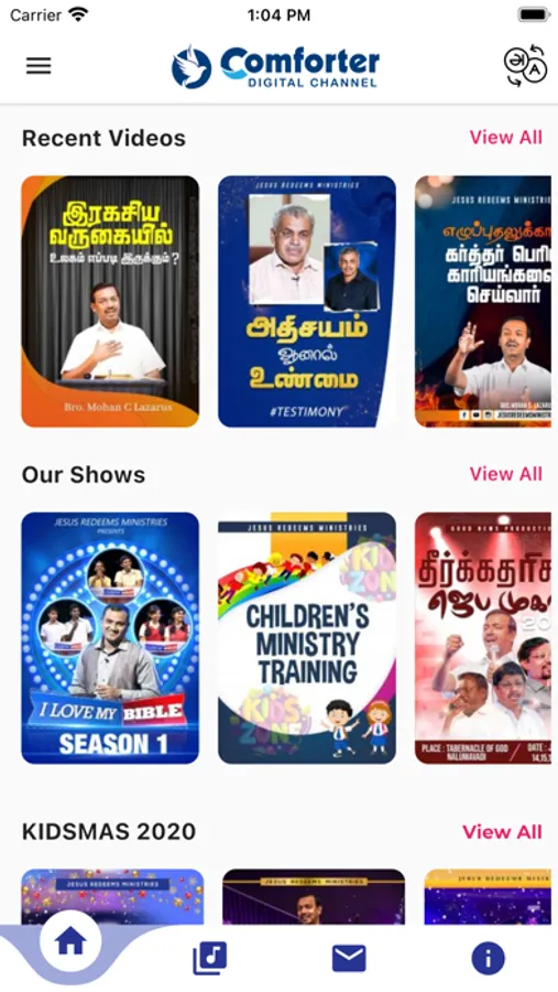 The Comforter TV., is an initiative of Jesus Redeems Ministries to Comfort every Soul around the Globe through the far reaching Digital Media Platform. We stream 24x7, the Gospel of Jesus Christ, to the multi lingual audience, covering a wide range of Indian and International Languages like Tamil, Hindi, Kannada, Telugu, Malayalam, Punjabi, English, Arabic, Mandarin (Chinese), Hebrew, etc.,. The Comforter TV is birthed from the GOD –given vision to Bro. Vincent Selva Kumar and Bro. Mohan C. Lazarus, with the sole purpose of taking Gospel to the ends of the earth and thereby preparing the nations for the Second Coming of Jesus Christ. Comforter TV proves its uniqueness by addressing the disparate situations, struggles and needs of every precious soul, assuring them hope and life and comforting them in Christ, the Eternal Comforter. We are available at www.comforter.tv , IOS . Comforter TV dedicatedly ventures in search of every soul everywhere, doing the work of a missionary of Jesus Christ.