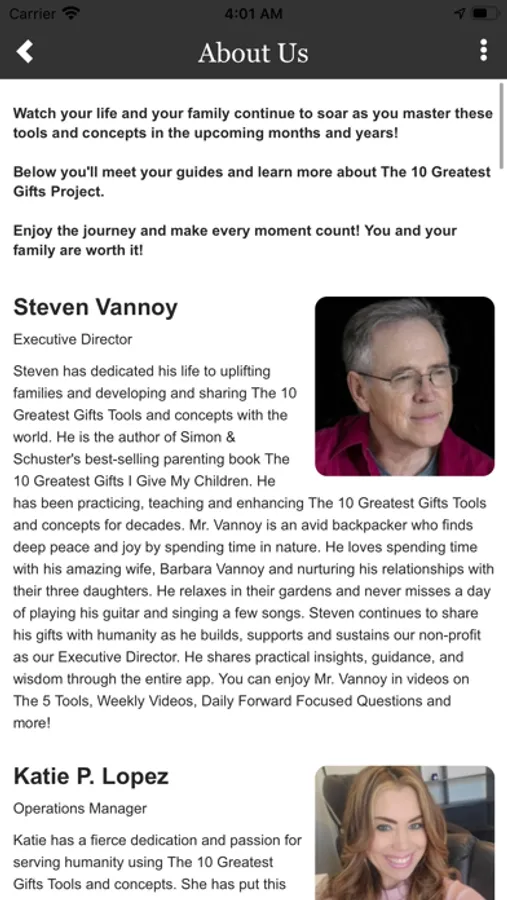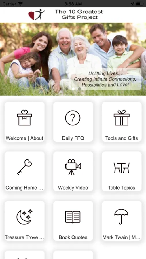 You'll be asked daily forward focused questions (FFQ). Explore the Tools & Gifts. You’ll get to meet Mark Twain and Maria von Trapp! You’ll be able to quickly track your progress with a periodic wellness check. You’ll have access to daily, table topics to support healthy engagement with your family during meal times. You’ll love our Treasure Trove as is supports you in creating a wonderful bedtime experience with your children. You will deepen your understanding of The 10 Greatest Gifts tools and concepts with educational, fun and humorous, weekly videos! You'll be encouraged to take an introspective approach as well as share your own experiences, ideas and stories. You'll also be able to quickly access all those powerful quotes you love from the book!