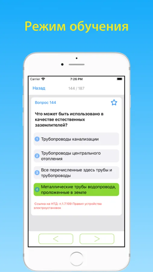 • Подготовка - Позволяет изучить вопросы в текстовом формате с отмеченными правильными ответами;