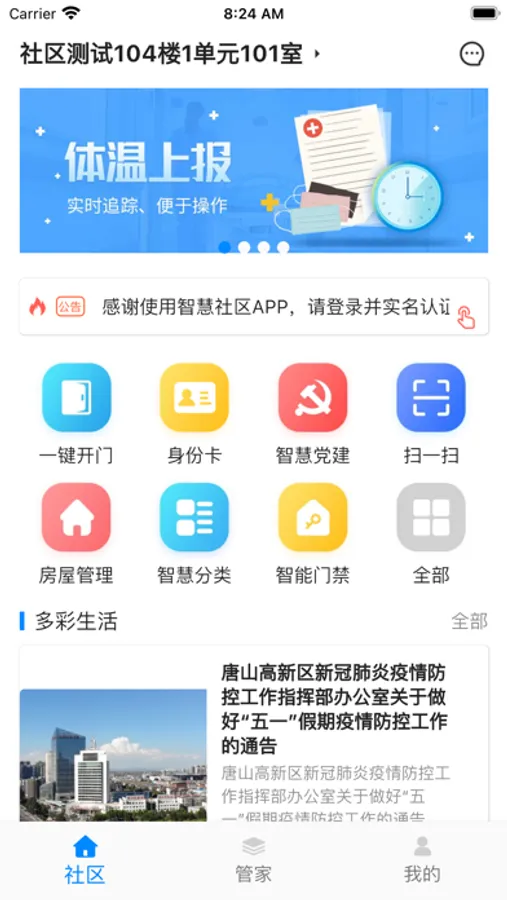 社区身份卡一卡通行,门禁通行,垃圾投放,身份识别等,智能水表,燃气报警器等智能设备管理,燃气或用水异常等推送用户消息,及时提醒;物业报修,社区封闭,可通过app远程开社区大门,单元门,可自行修改社区大门人脸识别设备录入图片