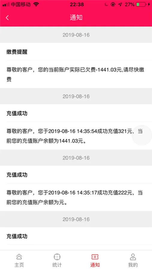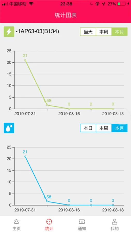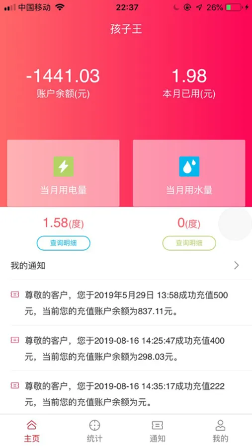 用户使用杭州银泰仪表管理APP,可以实时查看水电表扣费信息,以及近期扣费走势曲线。