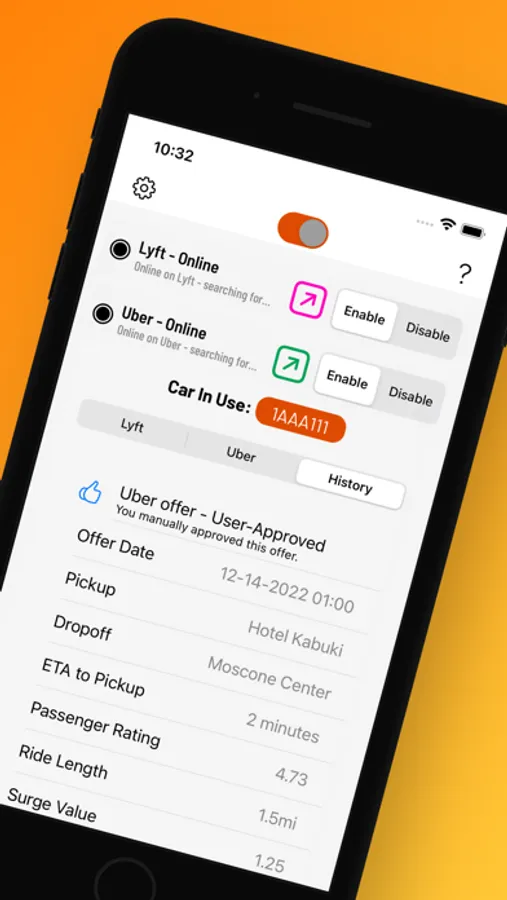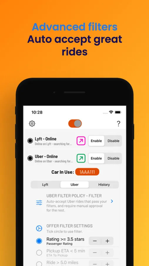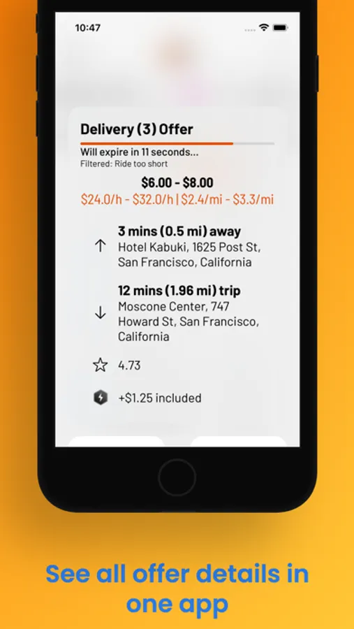 • Use filters to accept only the best offers, based on job type, fare, distance, earnings per hour, and more