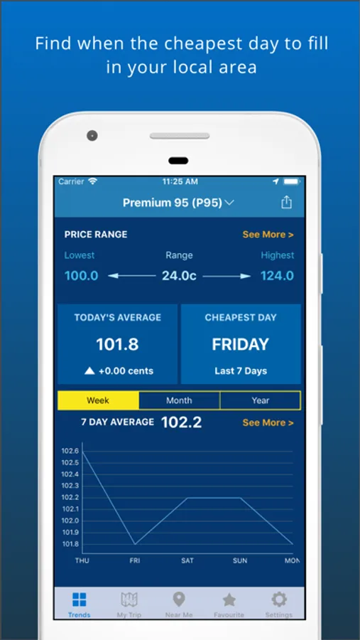 Trends allow you to see the price cycle, cheapest day to fill, price range in your local area & compare prices for different fuel types.