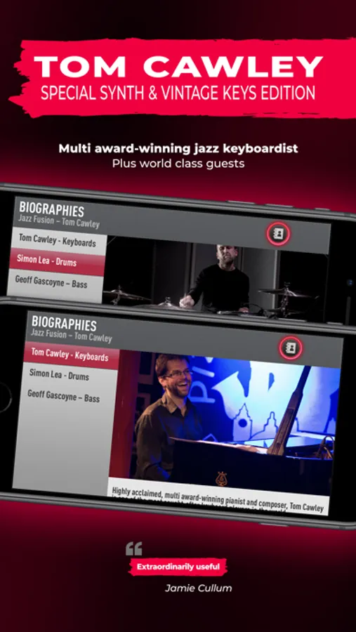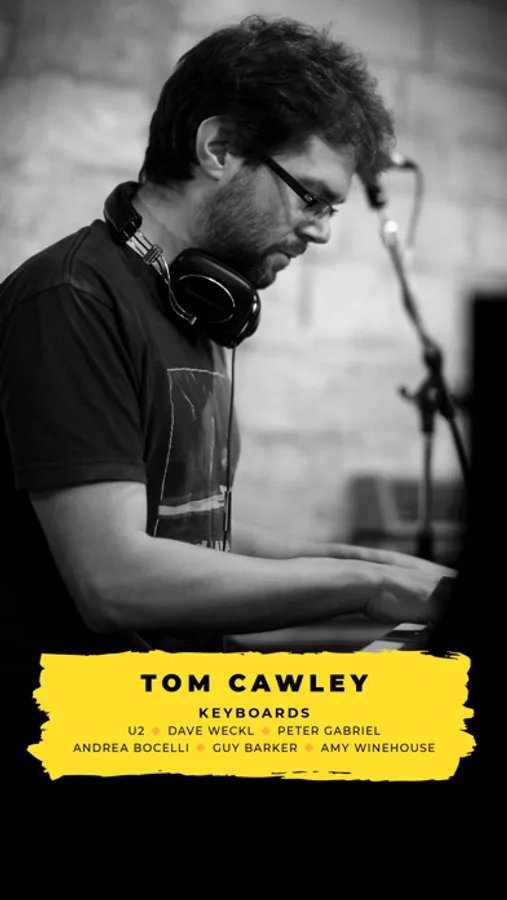 Highly acclaimed, multi award-winning pianist Tom Cawley is one of the most sought-after keyboard players in the world both as a jazz pianist (Dave Weckl, Jack DeJohnette, Charlie Watts, Jamie Cullum, Guy Barker...), and as a leading pop/rock keyboardist, recording and performing around the world with U2, Peter Gabriel, Andrea Bocelli, Amy Winehouse and many others.