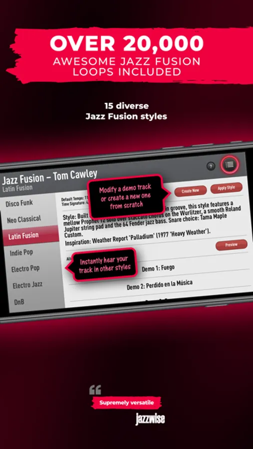 • 15 diverse Jazz Fusion styles: Acoustic Rock; 70s Funk; Pop Rock; Neo Soul; Psychedelic Soul; 70s Soul; Jazz Rock; Disco Funk; Neo Classical; Latin Fusion; Indie Pop; Electro Pop; Electro Jazz; DnB; Groovy Six Four