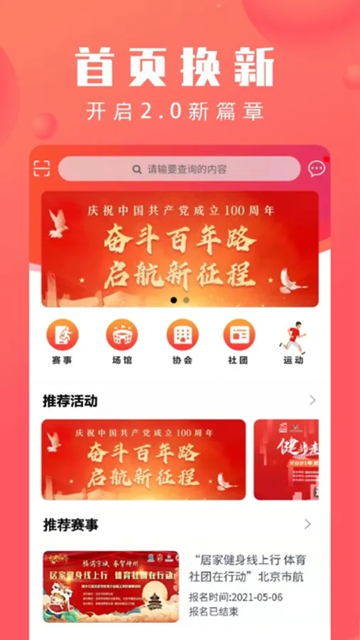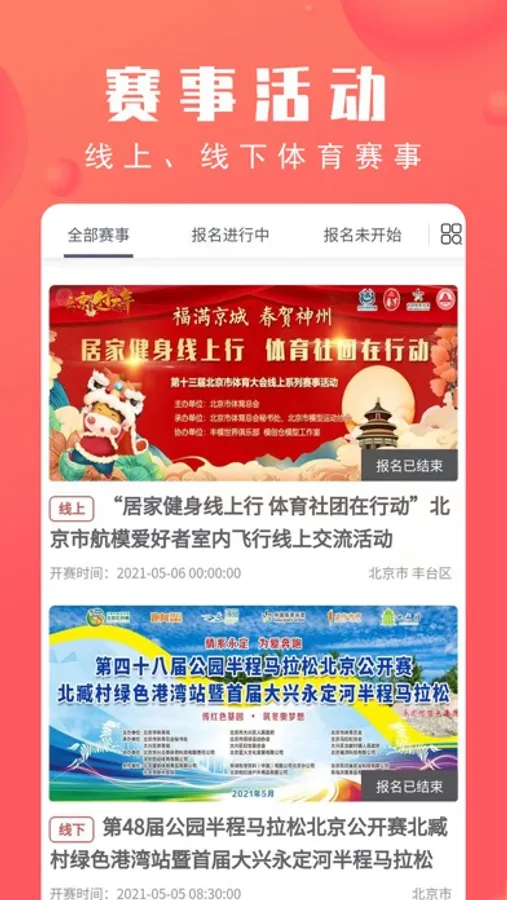 本APP是集线上线下比赛活动、体育社团服务、全民健身资讯等为一体的移动端应用。广大体育爱好者可以通过APP随时随地了解北京市全民健身赛事活动的信息,可以加入体育社团组织,也可以参与各类赛事活动。旨在为全民健身爱好者搭建一个全新专业平台,让更多热心全民健身事业的人有机会参与进来,开创全民健身的新局面。