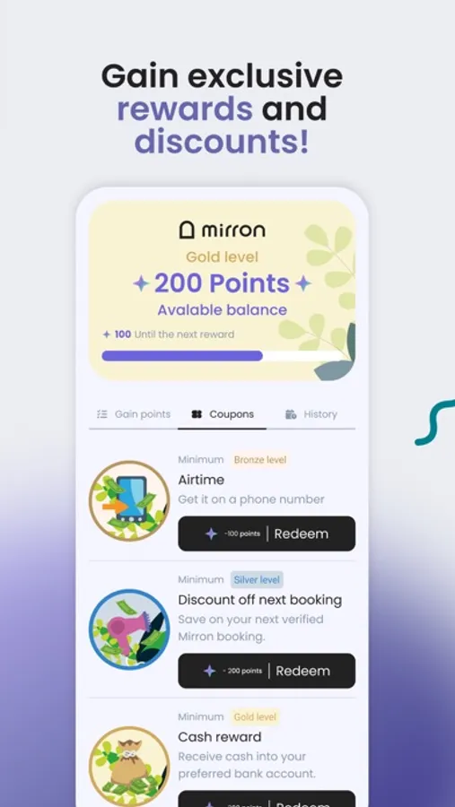 Earn 40 points just for completing your profile, and another 40 points for every booking you make. Plus, leave a review or share photos of your experience and earn additional 30 points. With the potential to earn up to 300 points, you can receive amazing rewards! Don't miss out on the chance to elevate your beauty routine with Mirron - download the app today!