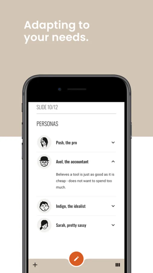 Most of the tools can be used in a multi-purpose way. For instance, while the personas slide is designed for creating personas/examples of your target groups, it can also serve as a nice "meet the team" solution. And why not use both? It´s totally up to you, let your creativity go wild!