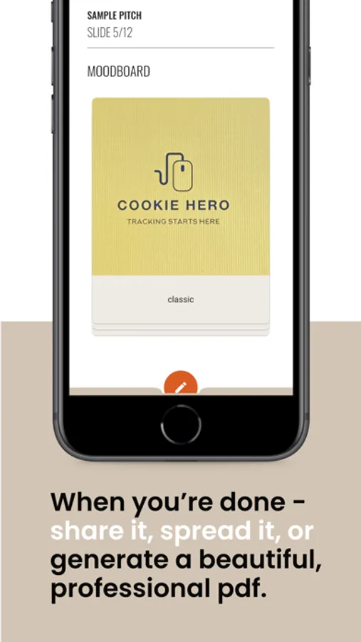 Pitchable is super easy to work with: you can add slides, edit them on the fly, restructure and change everything. Export your work for other colleagues to continue or save and create your final pdf.