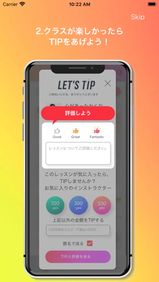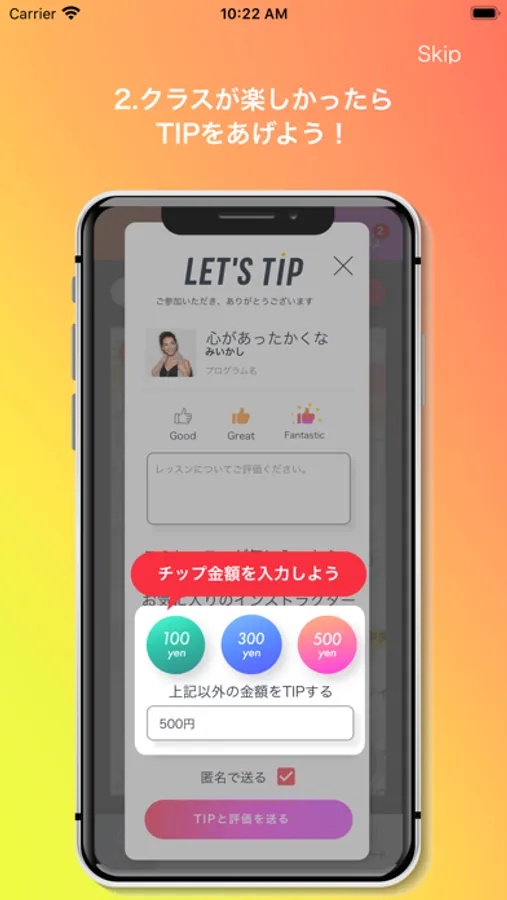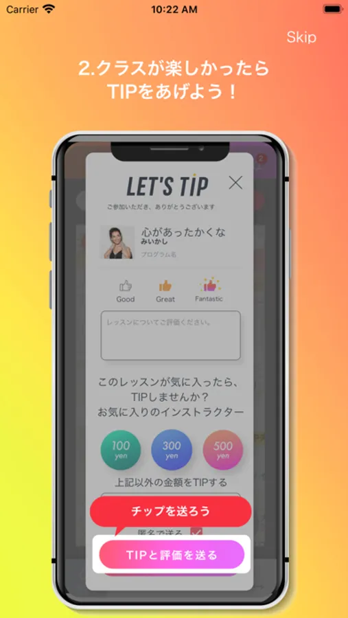 レッスン参加後やインストラクターへ【TIP】を送る機能です。大好きなあの人に感謝や応援の【TIP】を気軽に送ってみよう!
