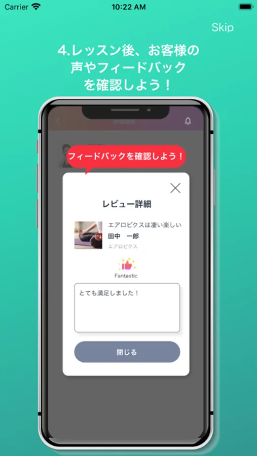 あなたが参加したレッスンへのレビューを投稿する機能です。レッスンでの感想を積極的に伝えて、インストラクターを応援しよう!