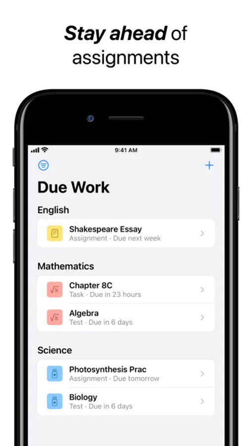 Schooly's easy-to-use interface makes creating assignments a breeze, and you can add rich metadata options like links, images, and notes to any due work. You can also create reminders to keep you on track, so you'll never miss a deadline again.