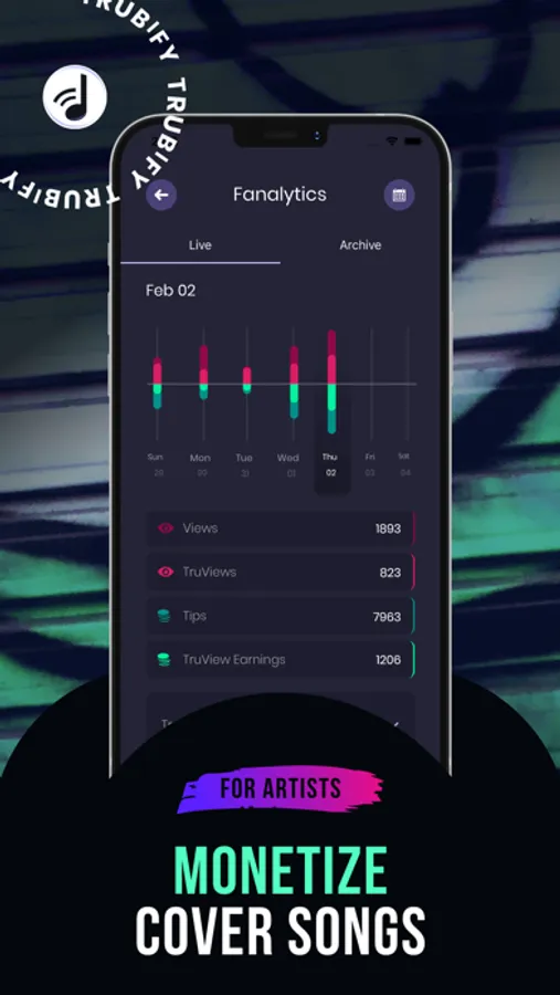 ARTISTS - Earn 2¢ per viewer on your livestreams. Earn 1¢ per viewer on your uploaded and archived videos. Receive tips, schedule Concerts, and build your loyal following. Earn money for cover songs! Trubify pays you more per stream than YouTube, Spotify, or any other app! The app is 100% FREE!