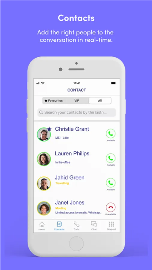 The softphone app works over WiFi, 3G/4G and 5G networks and unifies your business and phone contacts into the app.