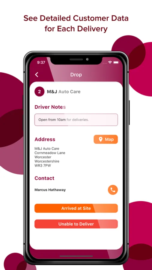 - Key details for each drop are displayed. Along with any specific driver notes added to the customer (e.g. opening and closing times), the driver can also easily launch maps to get directions along with quick contact if they need to call the customer.