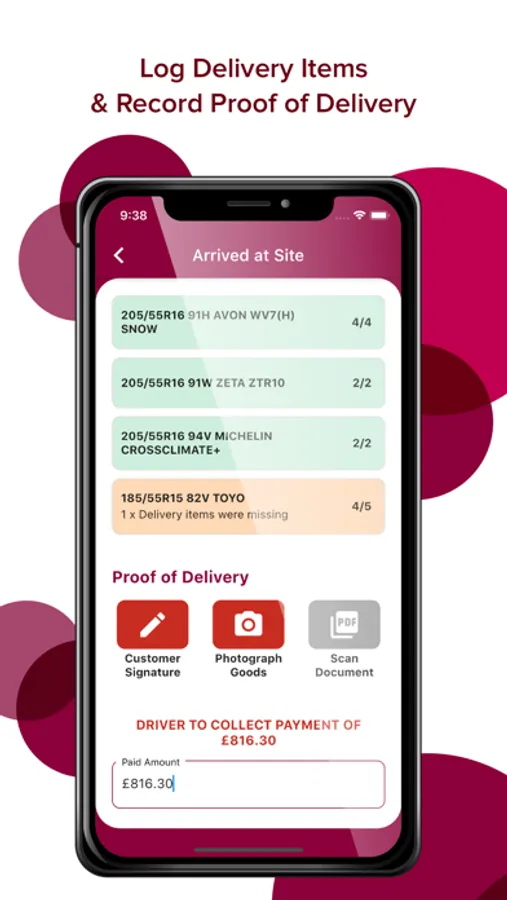 - All products to be delivered and collected are marked. If there is a delivery failure (e.g. tyres missing from the van), this can be recorded.