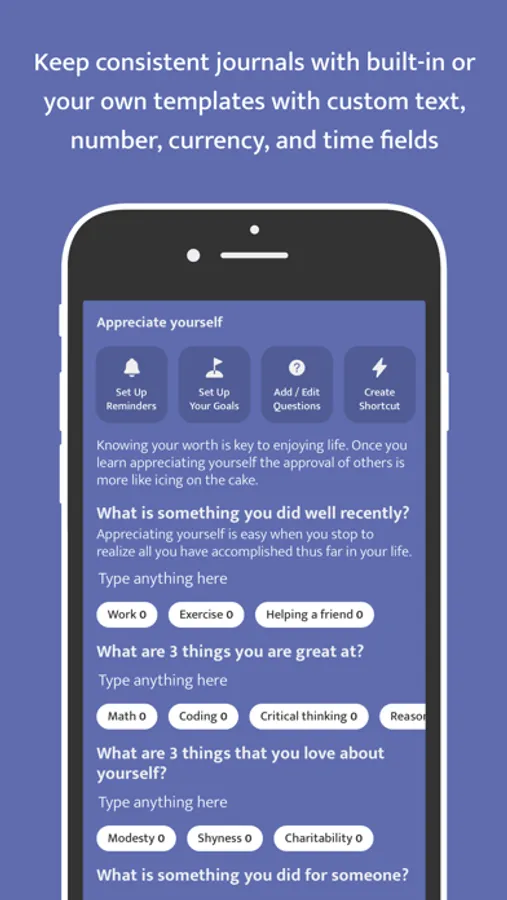 -Over 50 ready-to-use mindful journals or create your own custom guided journals to keep consistent journals with text, number, currency, and time fields