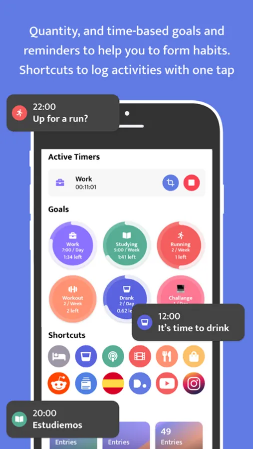 -Quantity, summary, and time-based goals and reminders to help you to form habits and to be more consistent