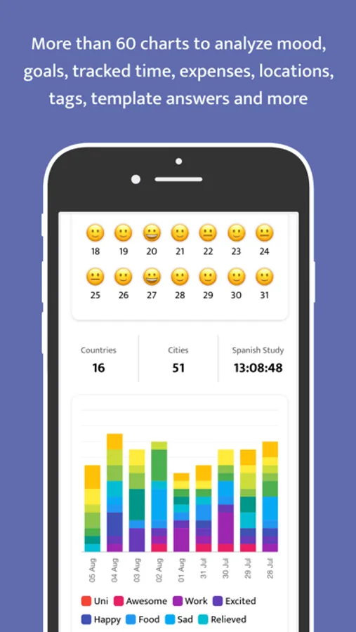 -More than 60 charts to analyze mood, goals, tracked time, expenses, locations, tags, template answers, and more