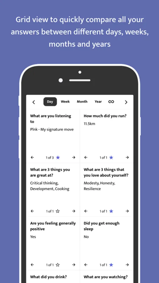 -Grid view to quickly compare all your answers between different days, weeks, months, and years