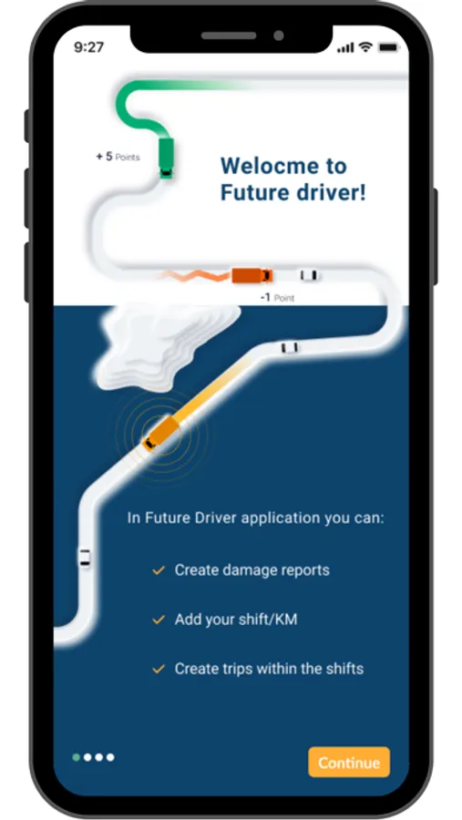 FUTURE DRIVER Application – a mobile application turning smartphones/tablets into superior inspection and reporting tools allowing users to register trips, take pictures, make comments, create instant equipment reports, tyre reports, view and update the information about an equipment/asset and its relevant documents. All this happens through the applications using mobile devices connected to the Internet.
