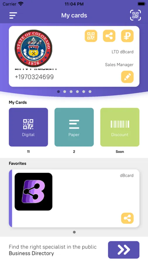 Share and take dBCards to find the right person as fast as possible or advise him to your friend or partner. You won't have to look for his e-mail or remember his full name, all the information will be fully visible by a single link or a generated QR-code.