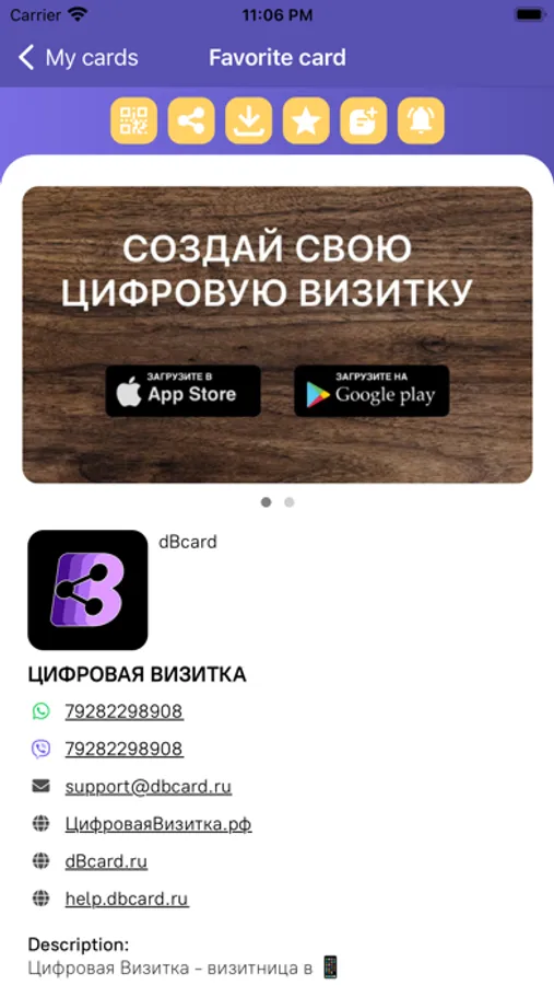 We aim to make the applicaton better in any detail. Write what we should change or modify to our e-mail support@dbcard.ru. The application is a customer of www.цифроваявизитка.рф