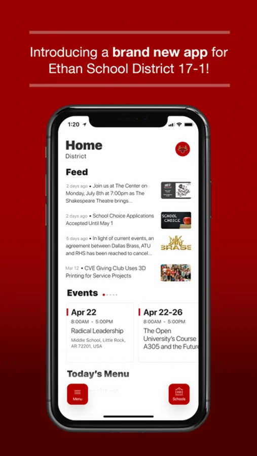The event section shows a list of events throughout the district. Users can add an event to their calendar to share the event with friends and family with one tap.