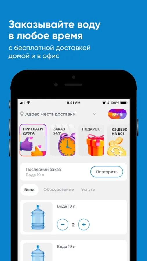 Скачайте бесплатное приложение на телефон и заказывайте чистую воду в удобное время!