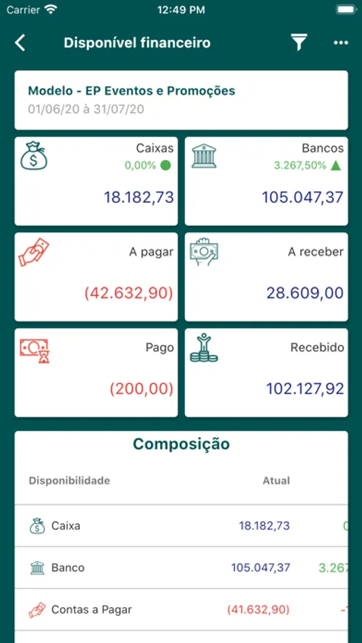 • Dashboard financeiro, com a posição financeira diária da empresa;