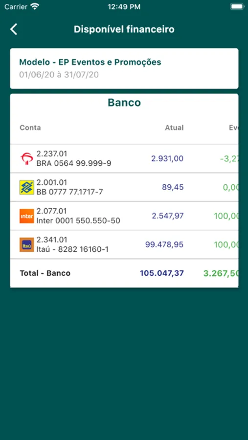 • Fluxo de caixa diário e mensal por níveis de categorias e unidades de negócios;