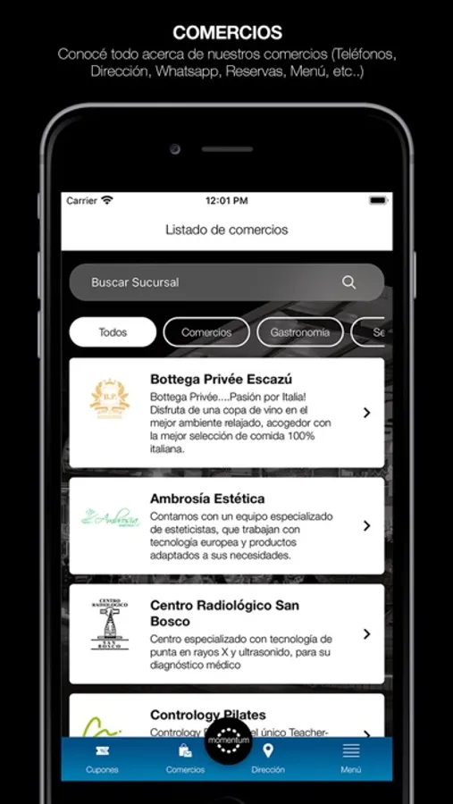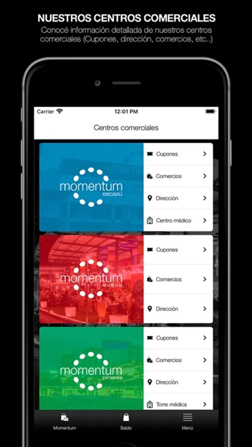 La aplicación cuenta con un directorio comercial que incluye la información general de cada uno de los servicios, comercios y restaurantes que se encuentran en los centros comerciales. Además de que en la aplicación se pueden encontrar cupones de descuento redimibles en los diferentes comercios, servicios o restaurantes que se encuentran en Momentum Pinares, Lindora o Escazú.