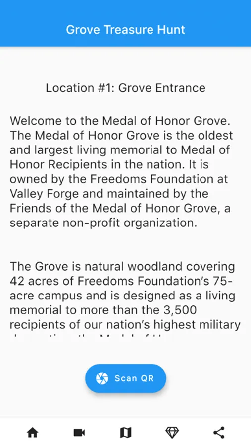 The last page of the app is the scavenger hunt. The user will be shown the information for each location and the location name and will try to find the location. Once they find the location with the information, they scan the QR code of the location and a success page is shown. The user then has the ability to continue to the next location or share their findings on social media by taking an image of the location.