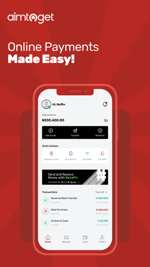 Your Aimtoget wallet is secured with a 4-digit transaction Pin to avoid unauthorised transactions from your wallet.