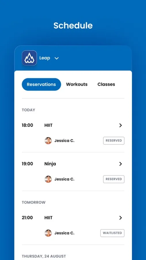 For members of Leap to reserve their place in a class, sign up for gym events, and general account management like updating headshots and credit card on file.