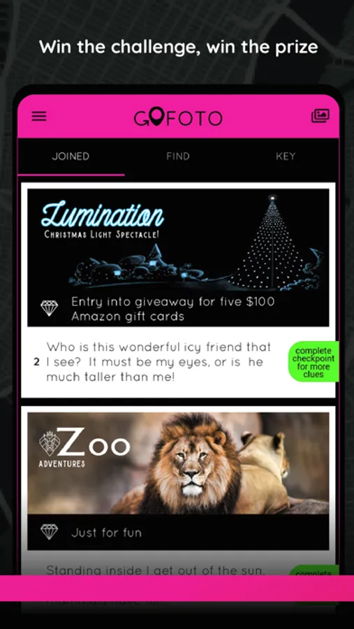 GOFOTO is a GPS challenge app that sends users on adventures solving clues and finding checkpoints. Players can post photos to social media as they participate to get their friends in on the action, or simply to share all that fun they are having…Nice work you prize winner! Now get out there and GOFOTO!
