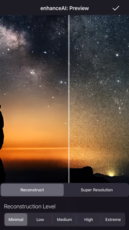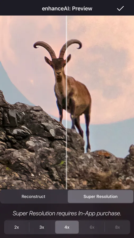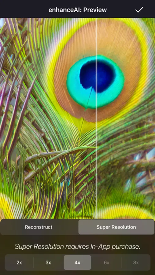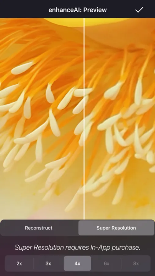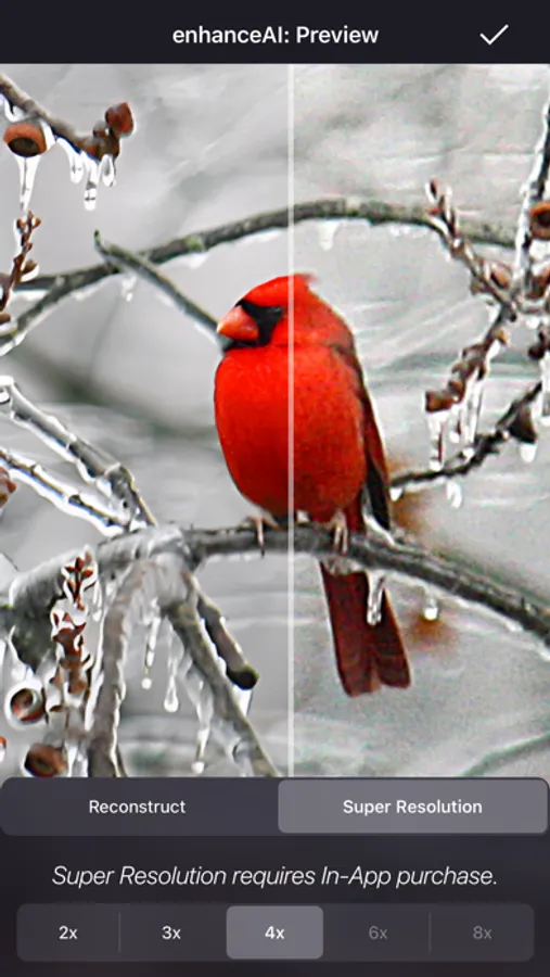We offer Super Resolution as an in-app purchase with AI trained at 4x and 8x (available as 2x through 8x). We're confident you'll be amazed by it, so we are happy to offer a free 3-day trial.