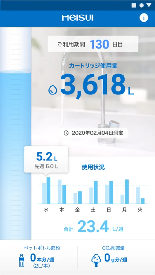 お使いのMEISUI浄水器「i-Aqua」とペアリングしましょう。浄水器に内蔵された流量計とマイコンからの情報を受け取り、現在の浄水器のご使用状況が簡単に把握できます。ご利用期間の日数表示、トータルの浄水使用量はもちろん、日別、月別の浄水使用量も確認できます。現在のご使用状況からカートリッジの交換時期も予測します。カートリッジの交換時期になれば、お知らせし、カートリッジの交換方法をご案内します。浄水器のお水を使用された際の、ペットボトルが節約できた本数や二酸化炭素削減量も表示されますので、環境負荷低減に役立ったことを実感いただけます。なお、本アプリではお客様の個人情報や浄水器の使用状況は一切、収集することはいたしません。