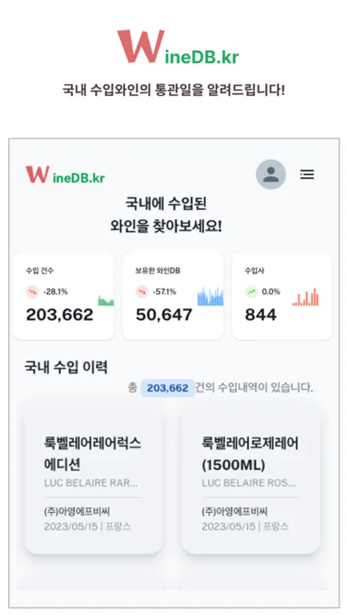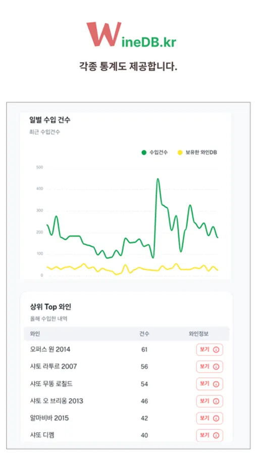 매일 통관되는 와인의 정보를 확인할 수 있으며, 와인을 수입하는 수입사정보도 함께 제공되는 서비스입니다.