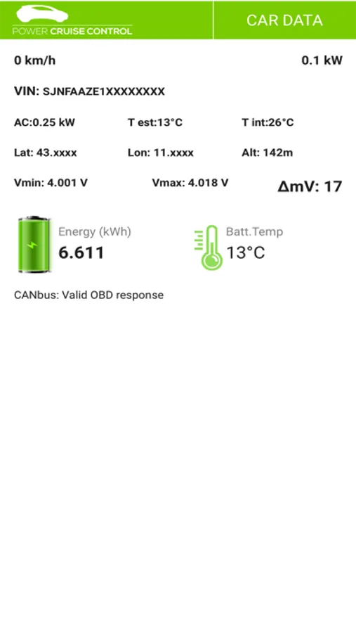 - is real-time connected to the car via a Bluetooth OBDII dongle and knows exactlythe SoC (State of Charge), the SoH (State of Health), the car's speed, instant power, and many other parameters;