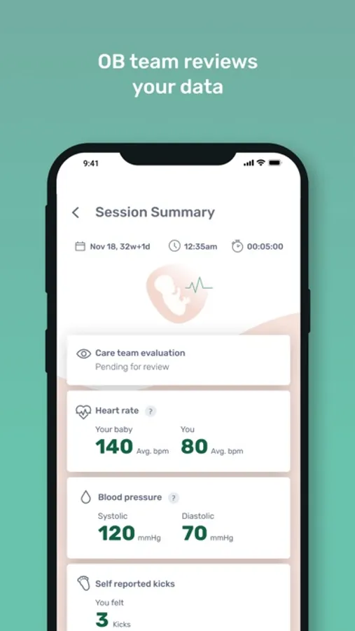 Follow along in your monitoring session to track your progress and bond with baby. Through the app, you can view and hear baby’s heart rate, record fetal kicks and monitor your heart rate.