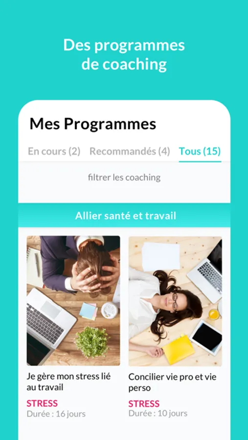 Maestro vous accompagne sur de nombreuses thématiques santé/bien-être : Nutrition, Stress, Fatigue, Moral, Mal de Dos, Activité Physique, etc. Parce qu’il s’agit d’une application intelligente, l’ensemble du contenu s’adapte à votre profil, à votre comportement et à votre mode de vie. Plus important encore : l’ensemble de notre contenu a été conçu et validé par nos médecins. Vous êtes entre de bonnes mains !