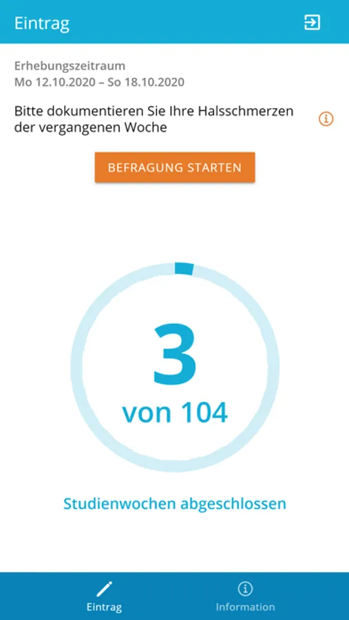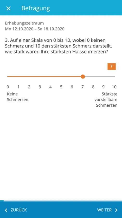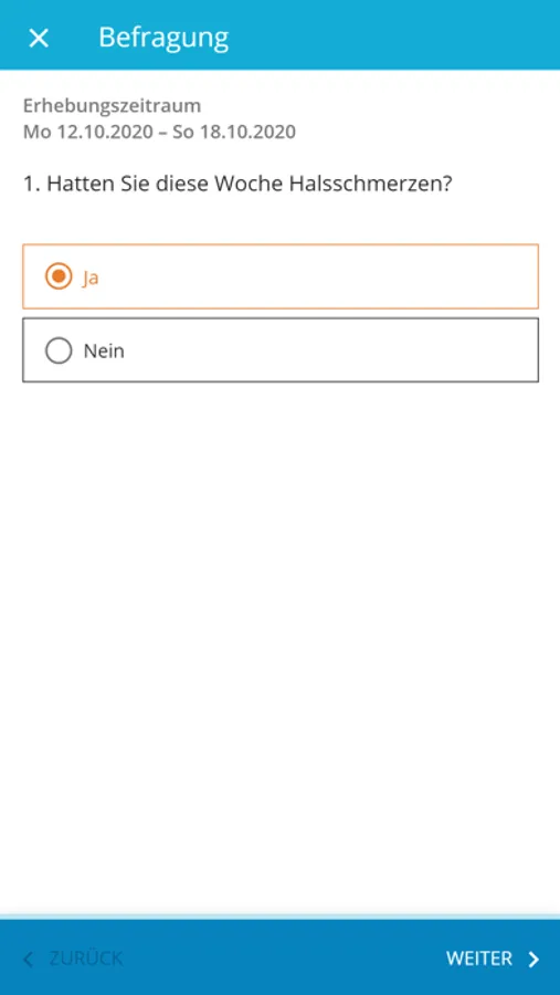 1. Wöchentliche Fragebögen mit Fragen zum Auftreten von Halsschmerzen. Push-Nachrichten dienen als Erinnerungshilfe, um auf notwendige Eintragungen hinzuweisen.
