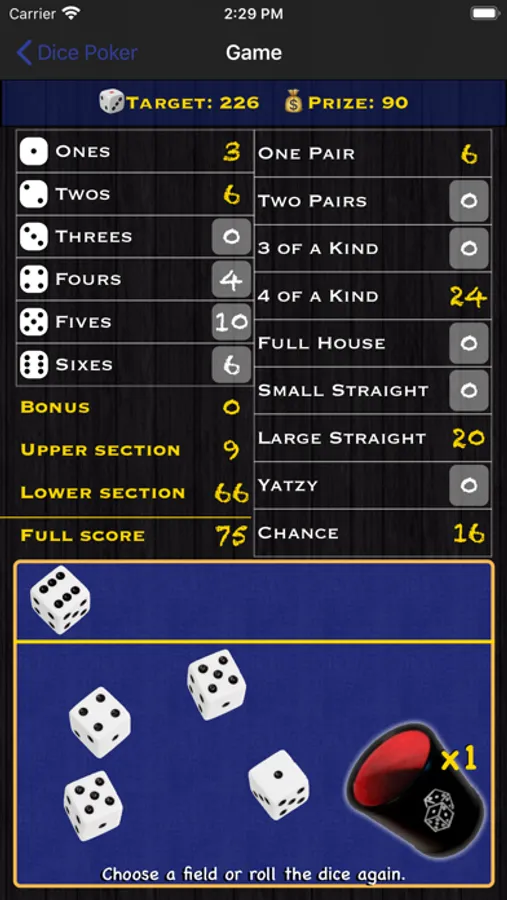 - Scoring: fixed or based on the dice values in some categories