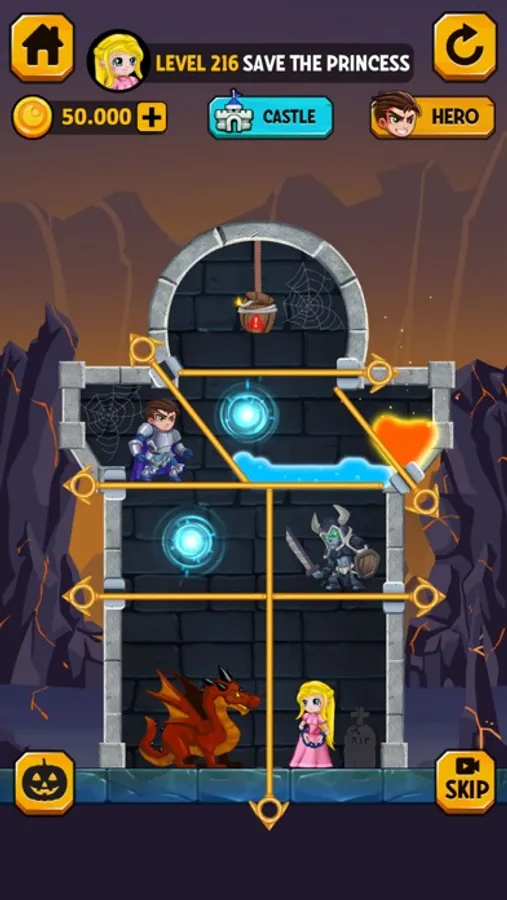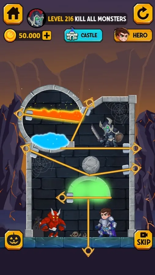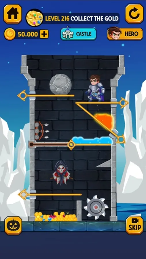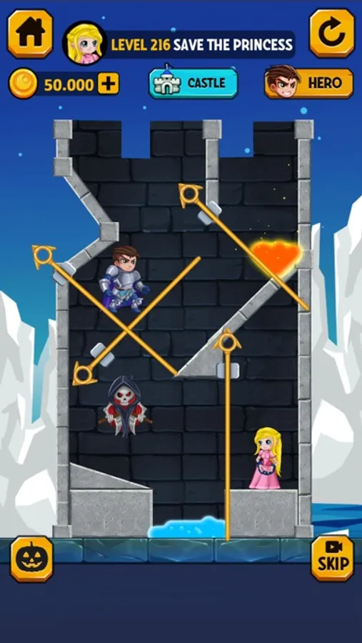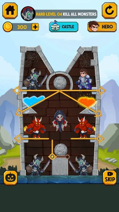 Solve puzzles and rescue hero collect all the treasures, kill monster and save princess. Pull the pin and destroy your enemies by pulling lava and poisonous gas into their puzzle units. Cut the ropes in order to rescue the princess from the scary monster.