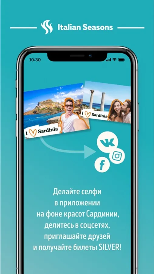 Сделайте селфи в приложении на фоне пейзажей Сардинии. Поделитесь снимком в одной из социальных сетей с хэштегом #СЕЛФИДОСАРДИНИИ
