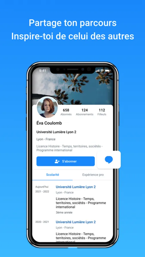 1 - Crée-toi un profil année après année avec ta formation lycée, tes études, et bientôt tes stages, alternances et tes jobs
