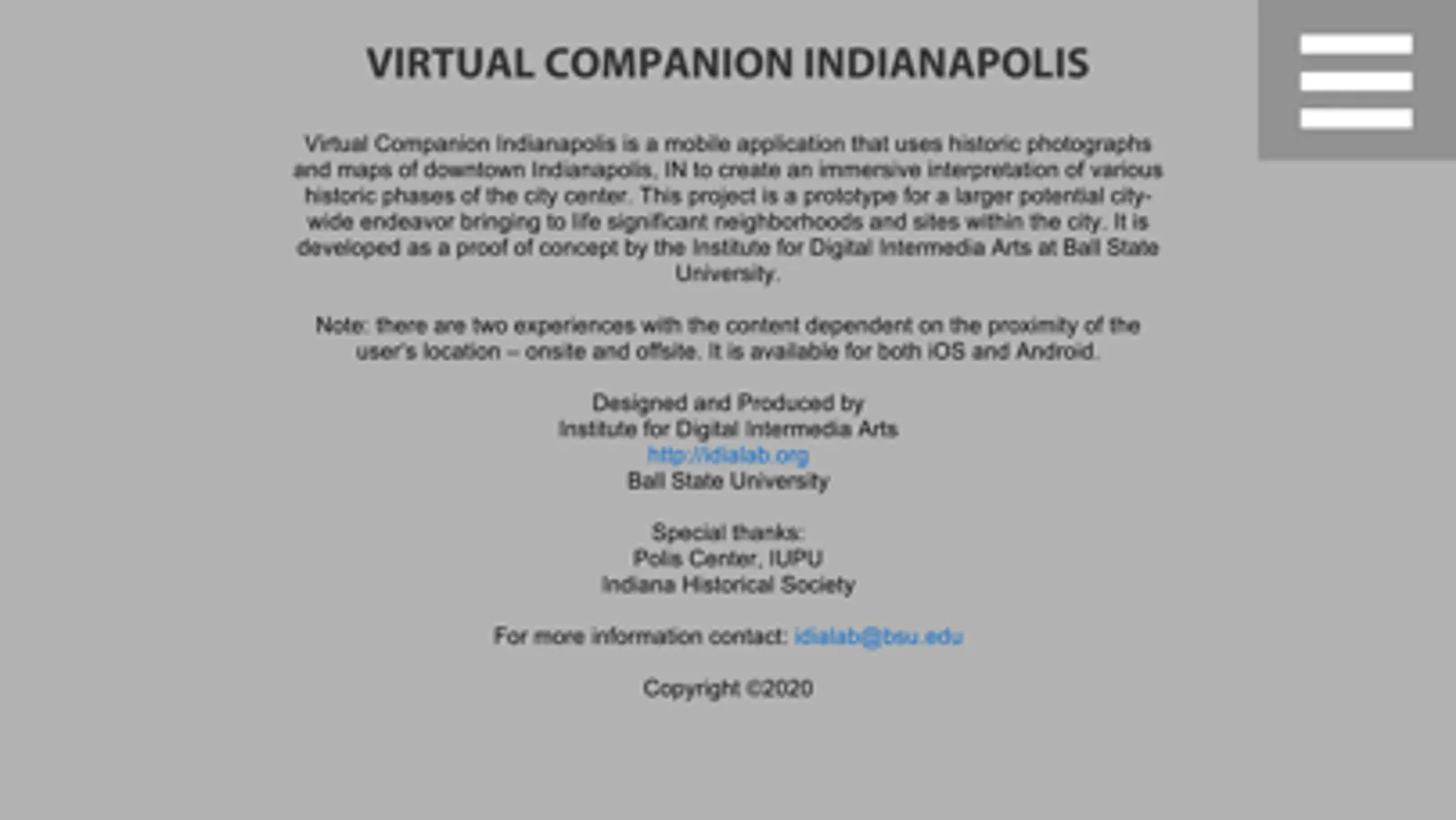 Virtual Companion: Indianapolis is a mobile application that uses historic photographs and maps of downtown Indianapolis, IN to create an immersive interpretation of various historic phases of the city center. This project is a prototype for a larger potential city-wide endeavor bringing to life significant neighborhoods and sites within the city. It is developed as a possible collaboration between the Institute for Digital Intermedia Arts at Ball State University, the Polis Center at Indiana University Purdue University Indianapolis and the Indiana Historical Society.